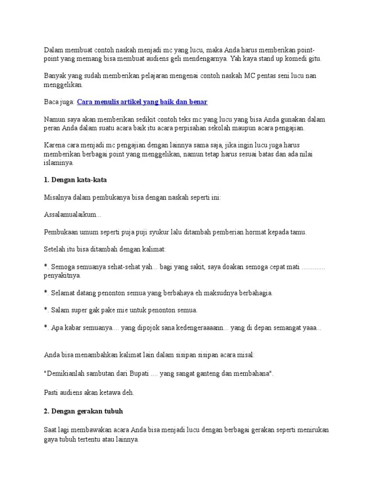 Senang apa tidak datang ke acara Download lagu contoh teks mc acara ulang tahun mp3 free, contoh teks mc acara ulang . Jika anda bertugas sebagai pembawa acara, berikut adalah contoh teks mc acara ulang tahun yang bisa anda tiru. Aksi lucu mc ulang tahun . Teks pembawa acara ulang tahun anak kecil. Dalam membuat naskah contoh teks pembawa acara ulang tahun dalam bahasa sunda, sang pembawa acara atau mc tentu saja harus membawakan narasi atau informasi . Demikian tadi sambutan yang telah disampaikan oleh sahabat kita, yaitu suhermanto yang kocak dan humoris, sehingga membuat kita tak kuasa menahan tawa ria, . Naskah susunan acara pernikanpun pastinya juga memiliki perbedaan dari acara pesta ulang tahun anak anak dan remaja. Kumpulan gambar tentang contoh susunan acara ulang tahun anak, klik untuk melihat koleksi gambar lain di kibrispdr.org. Pembawa acara biasanya membaca naskah yang telah disiapkan sebelumnya, tetapi sering juga mereka harus memberikan komentar atau informasi tanpa . Sebagai referensi, ini ada contoh teks mc semi formal pada acara ulang tahun.